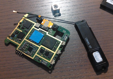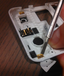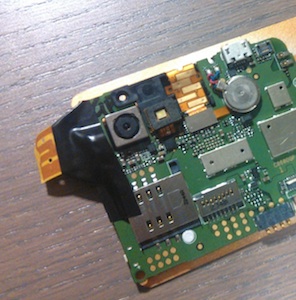 There are two antennas that are essential for connectivity through JanOS. The first one is the WiFi antenna. On the phones we've seen so far this is always a paper antenna (like the one above) which is glued to the casing of your phone and connects with some copper colored points to the mainboard. If you want to use WiFi on the board, use the screwdriver approach to un-glue the antenna, and attach it to the mainboard with some anti-static tape.